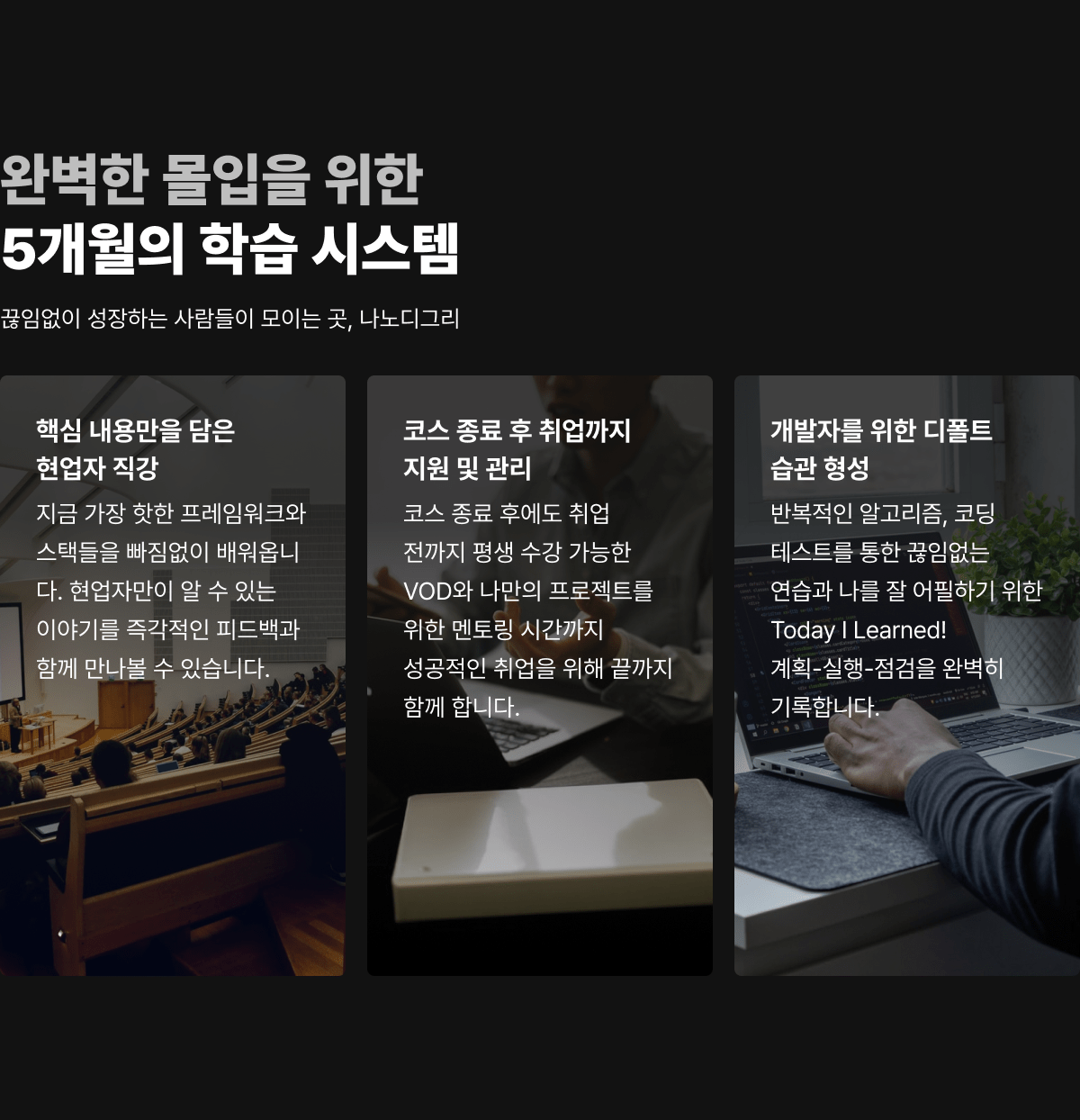 국비처럼 대규모의 인원이 수강을 하여 찍어내는 과정이 아닙니다. 소수정예 구성을 통해 개발자로 제대로 성장시켜 드립니다. 단순히 포트폴리오만 만들고 끝나는 것이 아닌, 이력서나 자기소개서 첨삭은 물론 면접 준비, 취업 노하우까지 개발자로서의 취업 A to Z를 제공합니다.